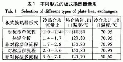 換熱器板間流道內(nèi)介質(zhì)平均流速以0.3~0.6m/s為宜,阻力以不大于100 kPa為宜。根據(jù)不同冷熱介質(zhì)流量比,可參照表1選用不同形式的板式換熱器,表中非對稱型板式換熱器流道截面積比為2。采用對稱型或非對稱型、單流程或多流程板式換熱器,均可設(shè)置換熱器旁通管,但應(yīng)經(jīng)詳細(xì)的熱力計(jì)算。