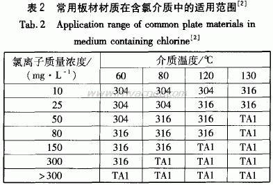不銹鋼板片可能產(chǎn)生腐蝕失效的現(xiàn)象有點(diǎn)蝕、縫隙腐蝕、應(yīng)力腐蝕、晶間腐蝕、均勻腐蝕等,應(yīng)力腐蝕的發(fā)生率較高。由氯離子引起的應(yīng)力腐蝕最多,板片材質(zhì)可根據(jù)介質(zhì)中的氯離子質(zhì)量濃度按表2選用 ],表中304、316代表的不銹鋼材料牌號為OCrl8Ni9、0Crl7Nil2Mo2,TA1代表鈦合金。